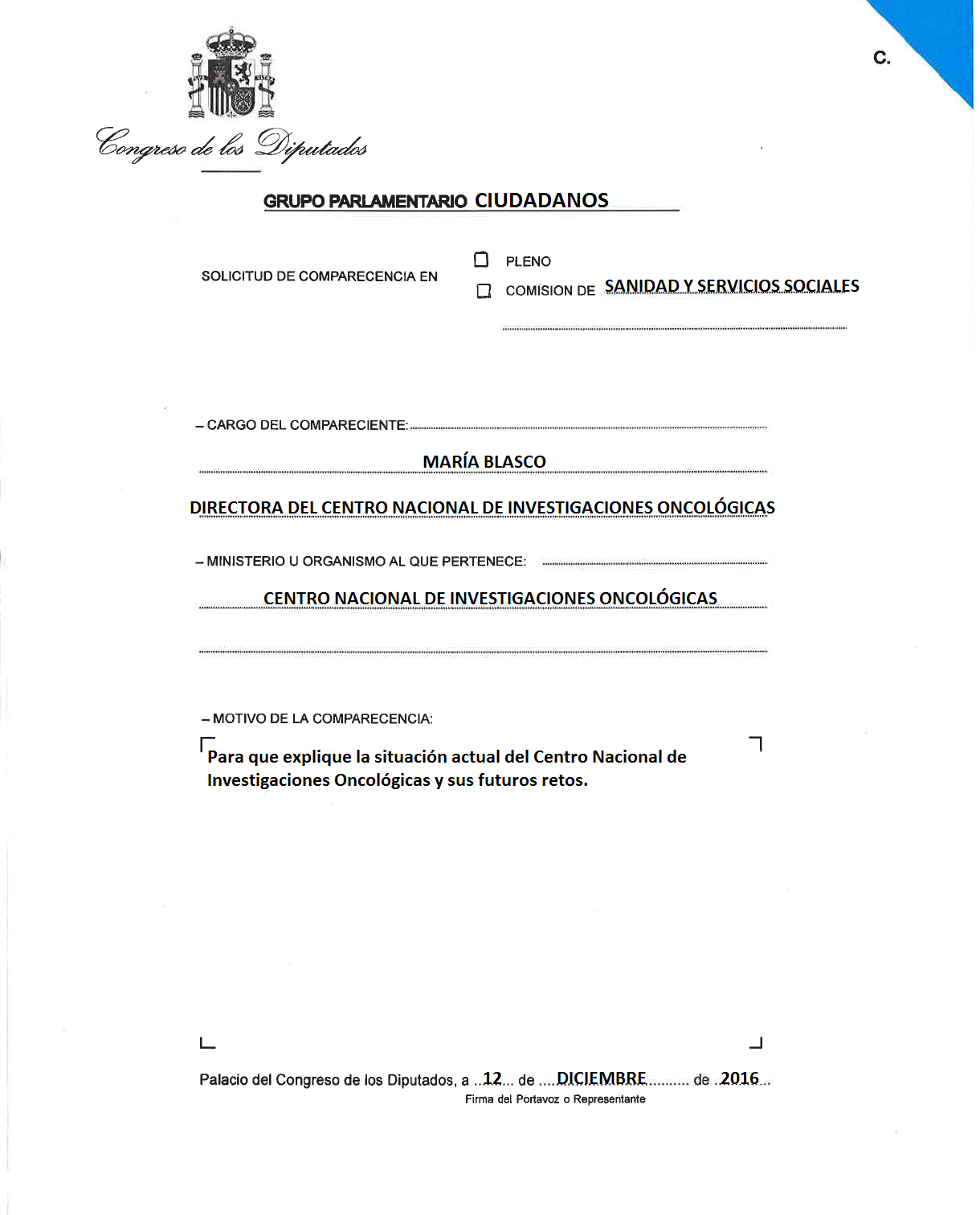 María Blasco, directora del Centro Nacional de Investigaciones Oncológicas (CNIO), en la Comisión de Sanidad para que explique "la situación actual del CNIO y sus futuros retos". Según comenta