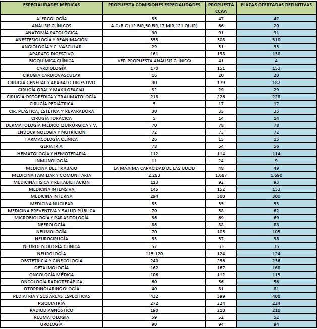 Las recomendaciones de las comunidades autónomas han sido aceptadas en 24 de las 44 especialidades médicas. En este sentido, se ha ofertado el número exacto de plazas que han solicitado las autonomías, lo que ha dejado en un segundo plano las propuestas que presentaron las comisiones de especialidades, en las que solicitaban ajustes para adaptar la formación a las necesidades del sector sanitario. Las especialidades que se encuentran en esta situación son: Alergología, Anatomía Patológica, Aparato digestivo, Medicina Interna, Medicina Nuclear, Neurología, Oncología radioterápica y Urología, entre otras.
