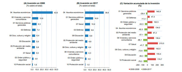 , el documento del órgano de gobierno asegura que el peso de las diferentes funciones de gasto en el conjunto de la inversión pública realizada en España se han visto modificadas desde el año 2000. Los