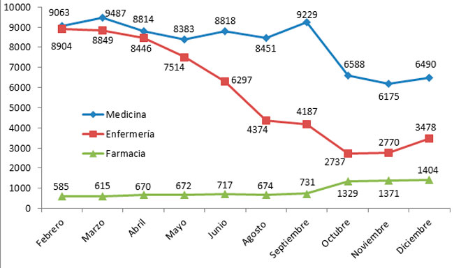 Si el mes de noviembre destacaba por experimentar un destacado ascenso para Enfermería y Farmacia, diciembre corrobora esta escalada que va 'sin frenos'. Tras muchos meses de caída, y por segundo mes consecutivo, las ofertas de empleo enfermero guardan un espectacular incremento al pasar de 2.770 plazas hasta las 3.478, es decir, 708 vacantes más para cerrar el año.