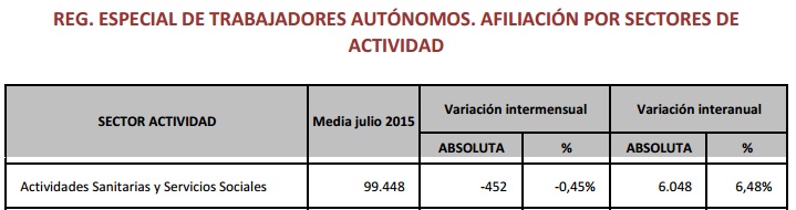 En cuanto a los sanitarios que apuestan por convertirse en autónomos, el Ministerio de Empleo indica que julio terminó con 99.448 afiliaciones, lo que representa una contracción del 0,45 por ciento con respecto al mes anterior, cuando se contó con 452 afiliados más. No obstante, si se compara con el mismo periodo del año anterior, el número de autónomos en el sector sanitario ha crecido un 6,48 por ciento, lo que se traduce en 6.048 nuevos afiliados en solo un año.